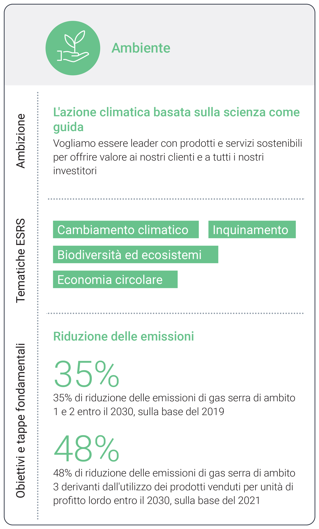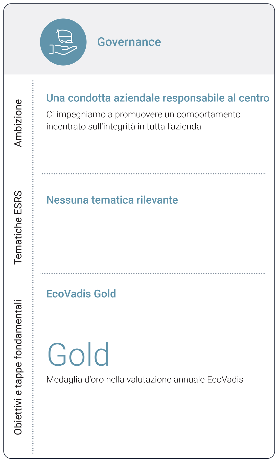 La sostenibilità è radicata nella nostra strategia aziendale e quindi integrata in tutte le nostre attività. Ci impegniamo a raggiungere quattro priorità di sostenibilità basate su argomenti rilevanti, diritti umani fondamentali e obiettivi di sviluppo sostenibile delle Nazioni Unite (SDG).